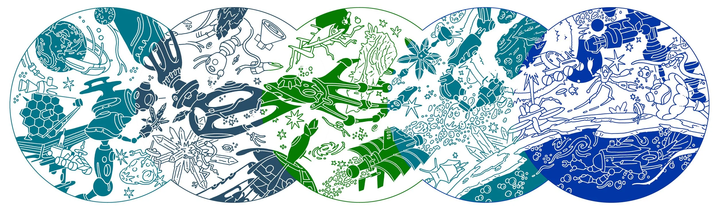 Large scale collage featuring the achievements and work of NASA JPL's Information Technology Section.